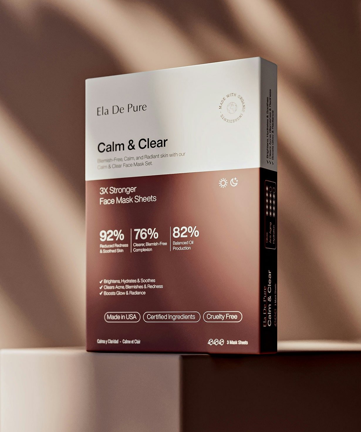 The Calm & Clear face mask sheet set by Ela De Pure is formulated to deliver visibly clearer, soothed, and hydrated skin. Made with certified organic ingredients, these 3X stronger sheet masks are clinically shown to reduce redness by 92%, improve blemish-free clarity by 76%, and balance oil production by 82%. Each mask is crafted to brighten, calm, and refresh your complexion, making it perfect for acne-prone or irritated skin. Cruelty-free, made in the USA, and enriched with botanical extracts, this set brings a gentle yet effective treatment to your skincare routine.